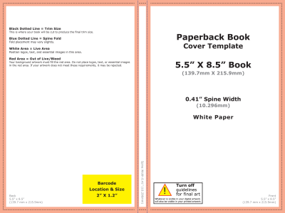 Abriremos el pdf con nuestro editor de imágenes preferido y en una nueva capa pondremos nuestra imagen de portada. Crearemos un lomo y una contraportada del mismo estilo y con los mismos colores. Y tendremos mucho cuidado de no poner nada sobre el lugar indicado para el código de barras y de que las letras de título, nombre o sinopsis en la contraportada, estén únicamente sobre la parte blanca.